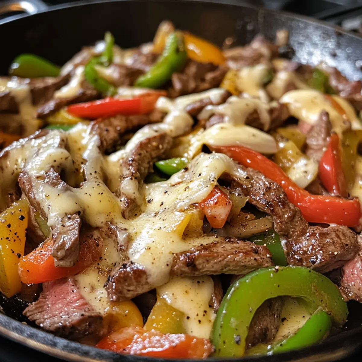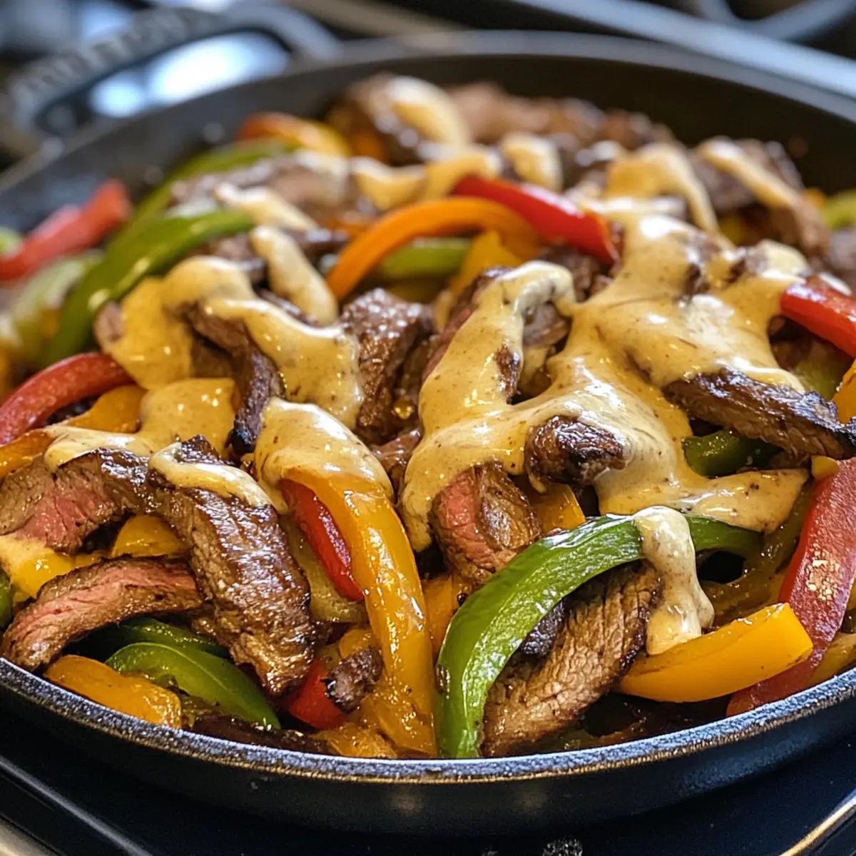 - Remove from heat, drizzle the cheese sauce over the steak and veggies, mix gently, and serve hot.