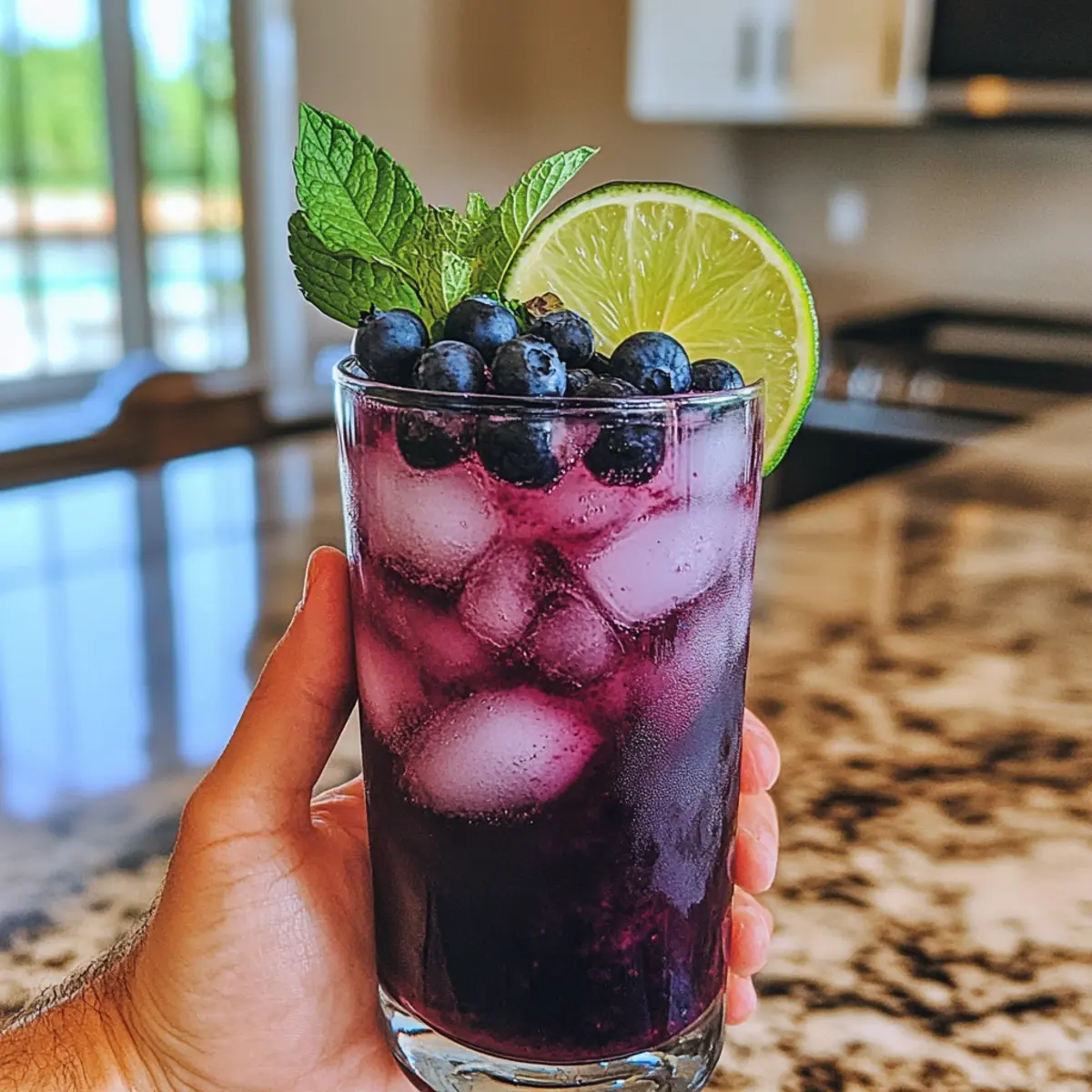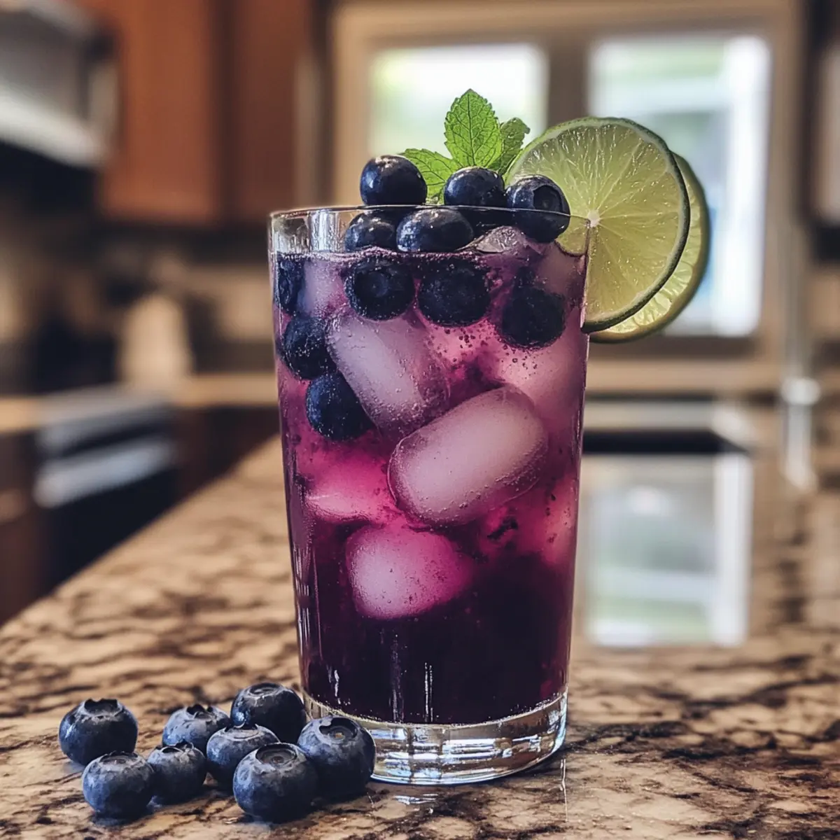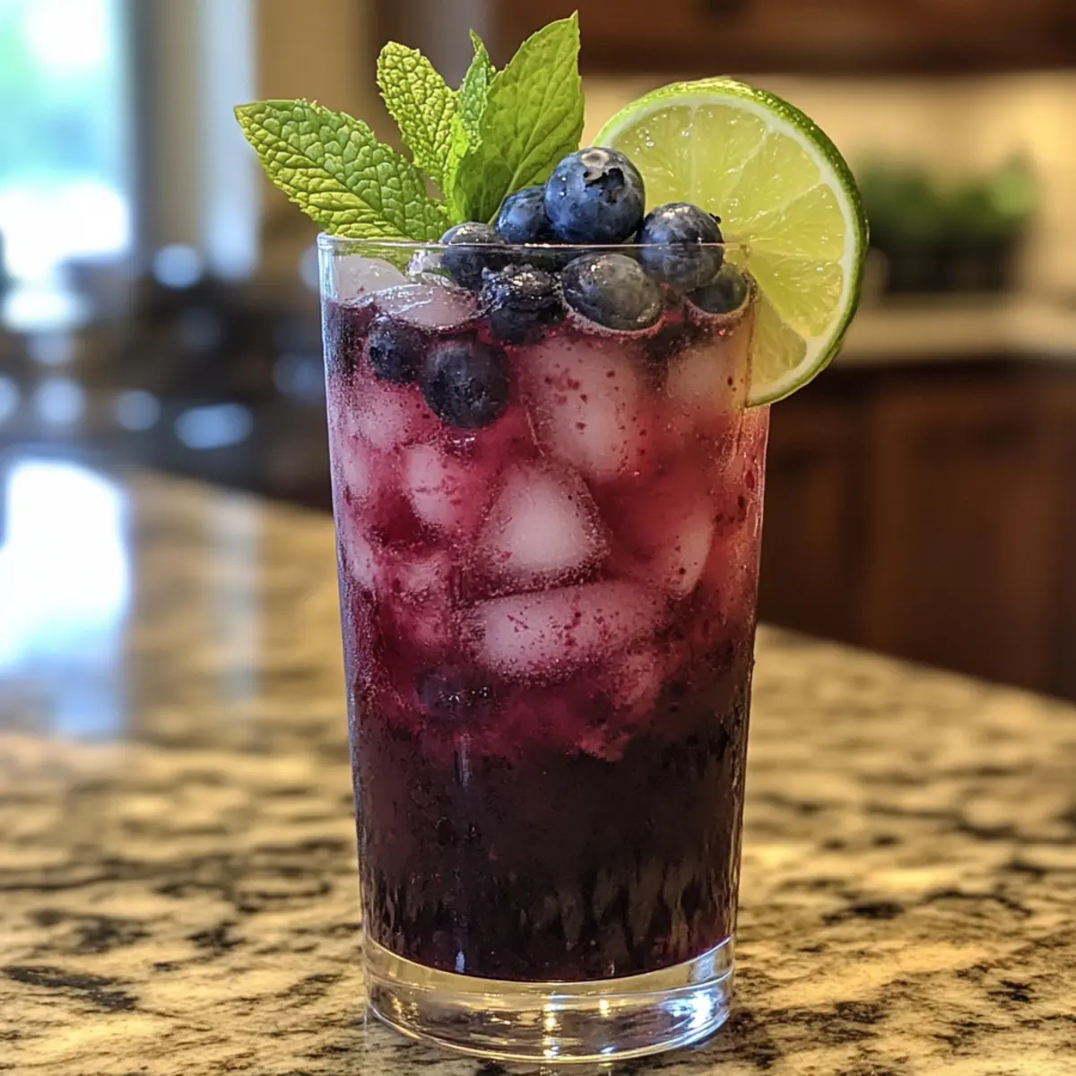 - Garnish and Serve: Garnish with extra blueberries, lime slice, and mint sprigs. Serve immediately.