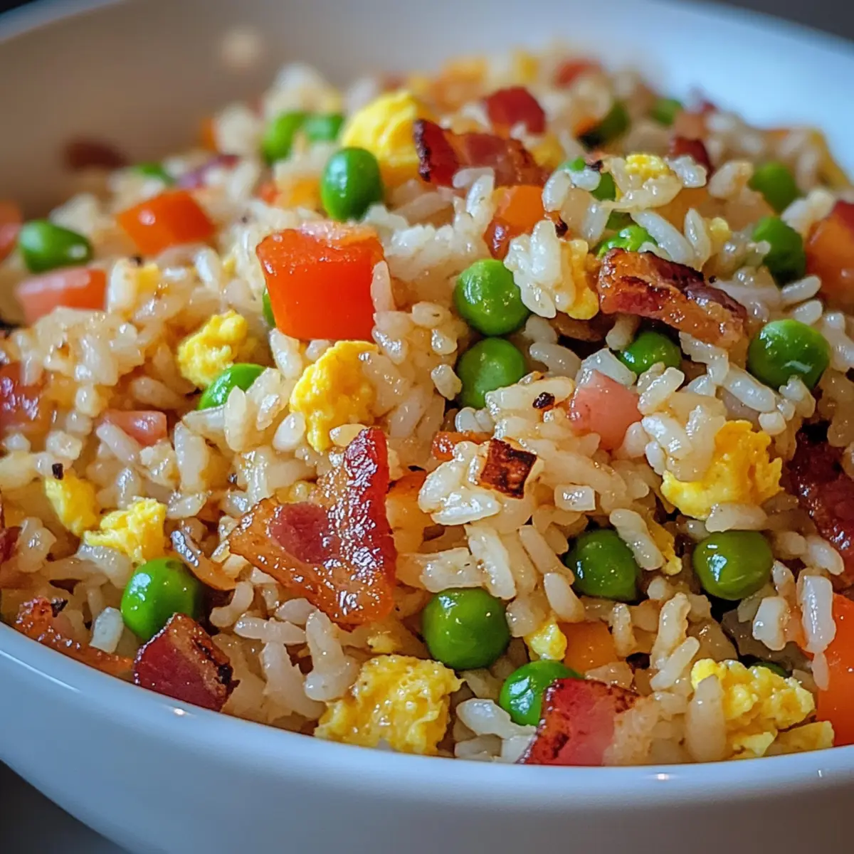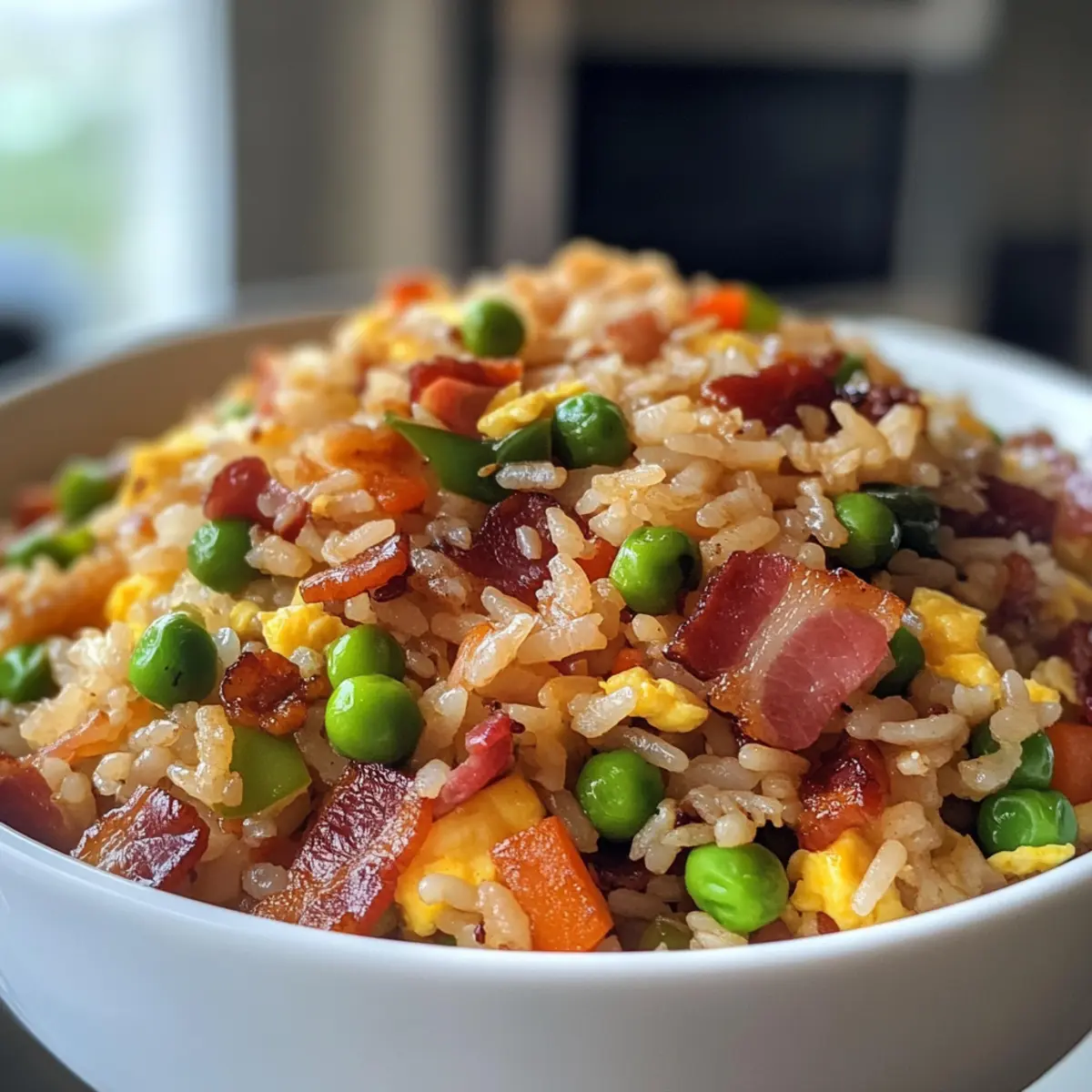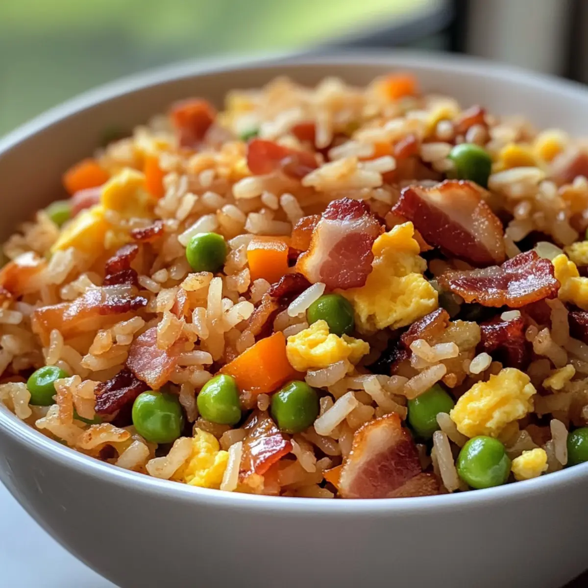 In a large skillet or wok, heat over medium-highheat. Add the bacon strips and cook for about 5–7 minutes until they are crispy and golden. Once done, remove the bacon and place it on paper towels to drain any excess fat, leaving the flavorful drippings in the skillet to add depth to your breakfast fried rice.