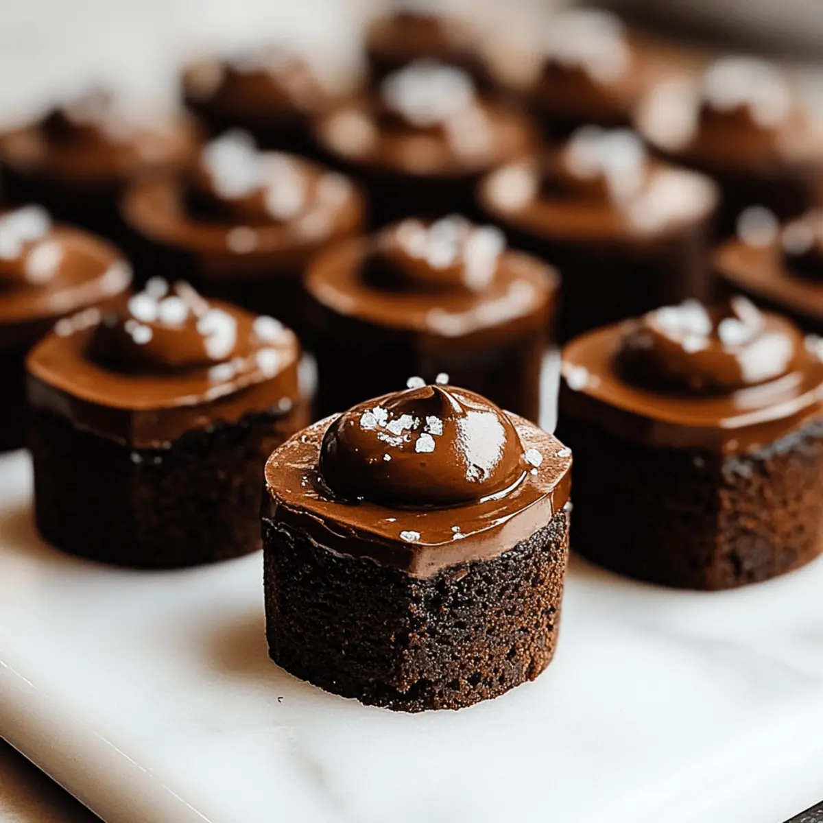 Once the brownies are completely cooled, use a sharp knife to cut them into small squares. Dip each square into the ganache, allowing excess to drip off. Carefully place the ganache-covered brownies on a wire rack or parchment paper for a moment before sprinkling each with a pinch of fleur de sel to elevate the flavors of your Brownie Petit Fours.