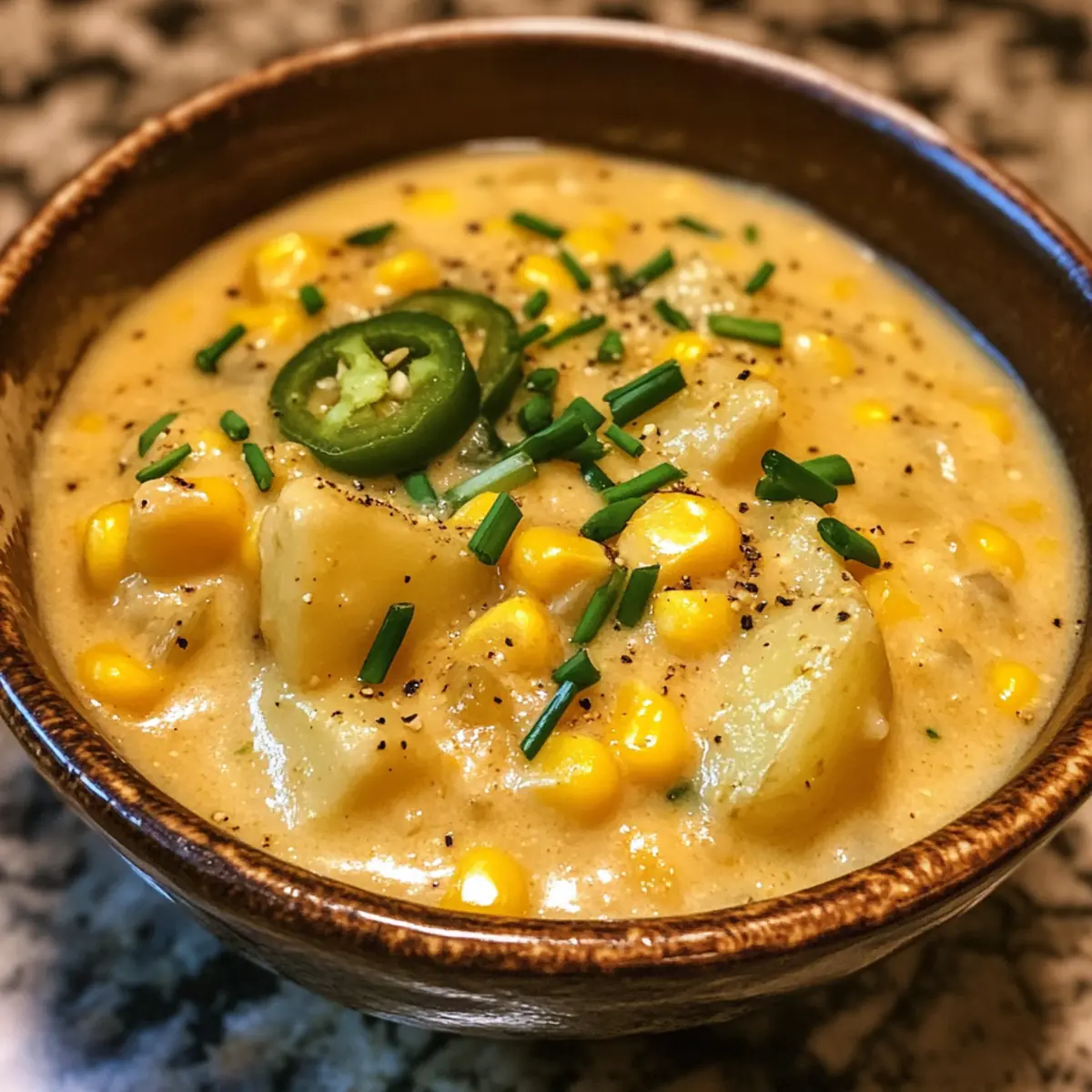 - Ladle the Creamy Jalapeño Corn Chowder into bowls and garnish with freshly chopped chives. For an extra touch of brightness, you might add a squeeze of lime.