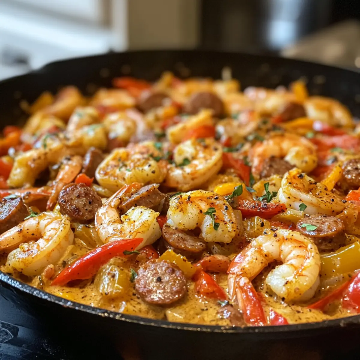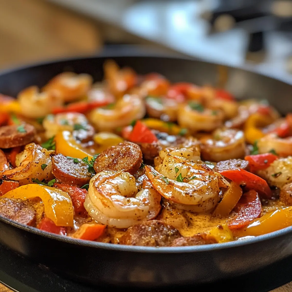 - Return shrimp and sausage to the skillet, stirring to coat in sauce. Cook for another 2–3 minutes.