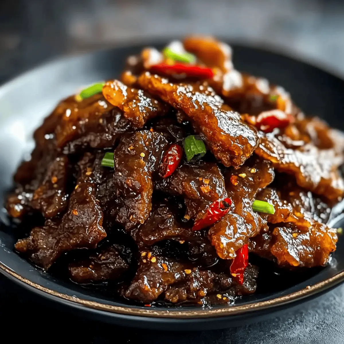 Finally, remove the skillet from heat and garnish your Crispy Chilli Beef with sliced red chilies and finely chopped green onions for a fresh touch. Serve immediately over a bed of steamed rice or noodles, allowing the vibrant colors to shine on your plate and enticing everyone to dig in!