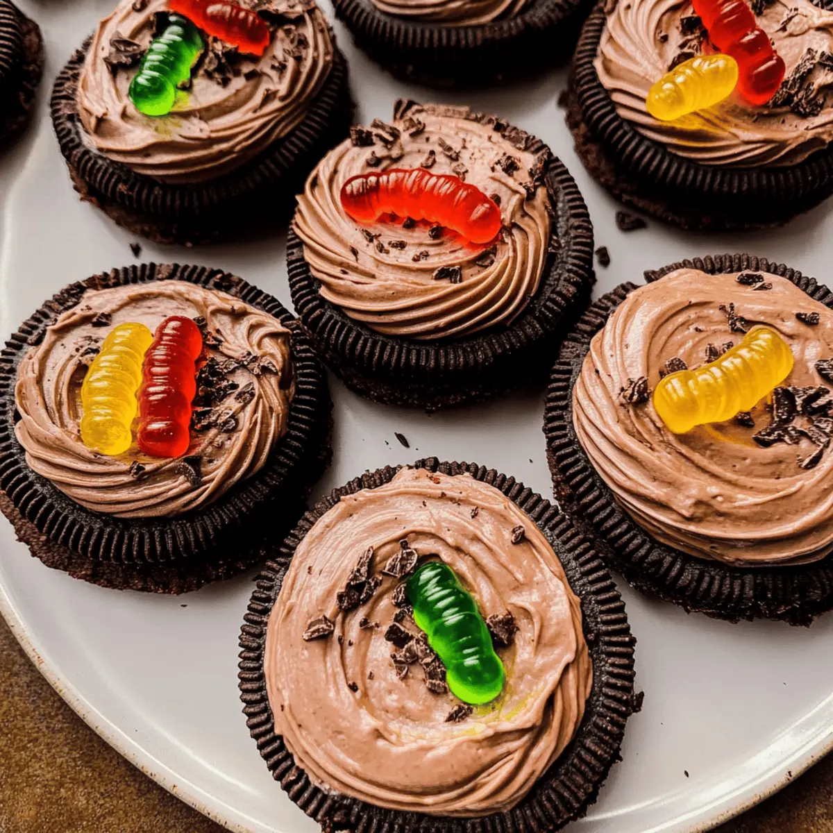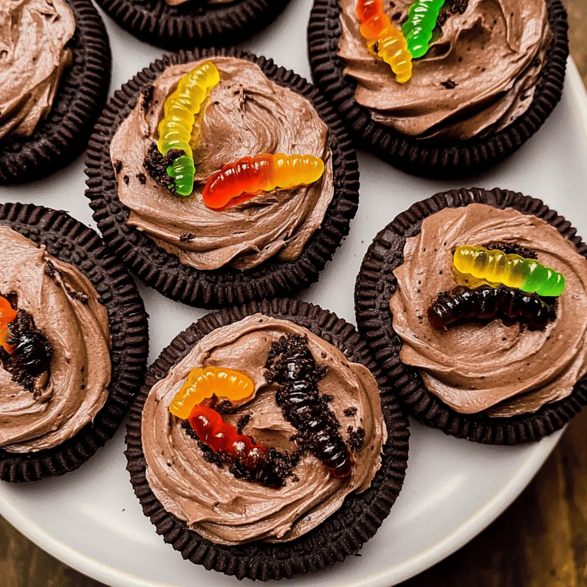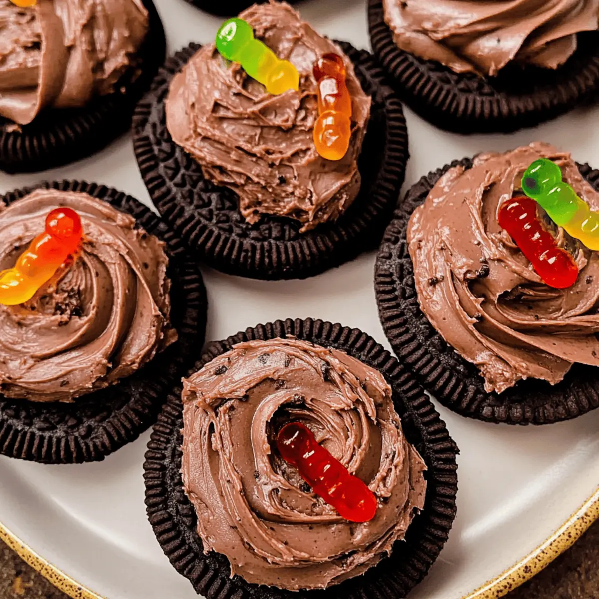 - Frost each cooled cookie generously and sprinkle with extra Oreo crumbs and place gummy worms on top.
