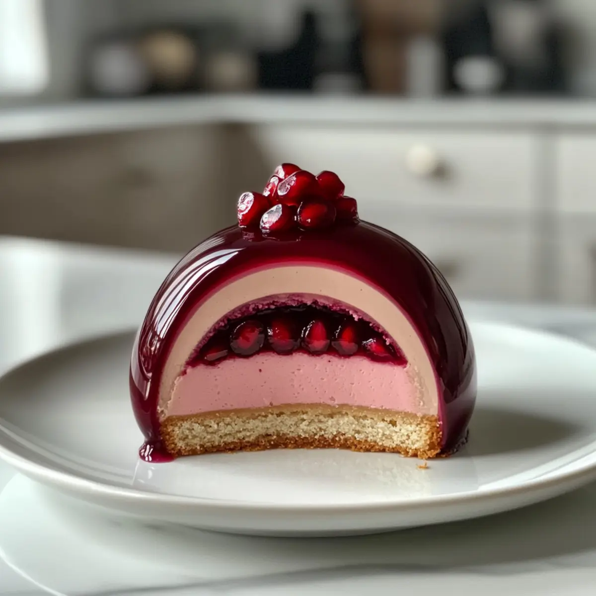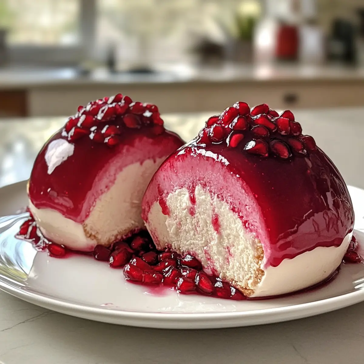 Allow the glazed domes to chill in the refrigerator for about 30 minutes to set the glaze. For an elegant touch, serve each Glossy Pomegranate Mousse Dome with a sprinkle of fresh pomegranate seeds and a mint leaf for color. Enjoy this stunning dessert at your next gathering!