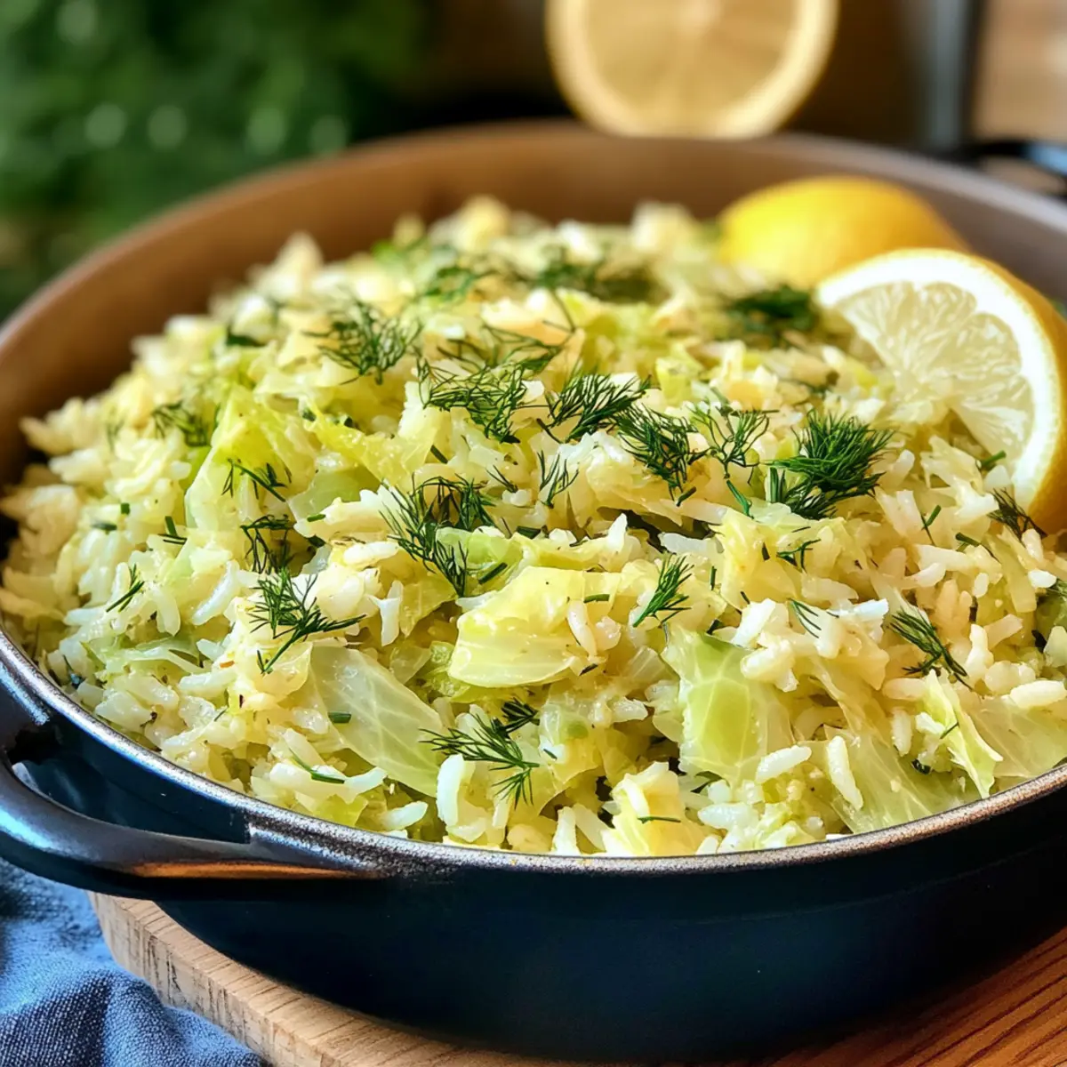 Once the rice is perfectly cooked and absorbed most of the liquid, remove the pot from heat. Stir in a handful of roughly chopped fresh dill and the juice of one lemon, adjusting the seasoning with more salt and pepper as desired. The Greek Rice with Cabbage is now ready to be served warm, bursting with flavor!