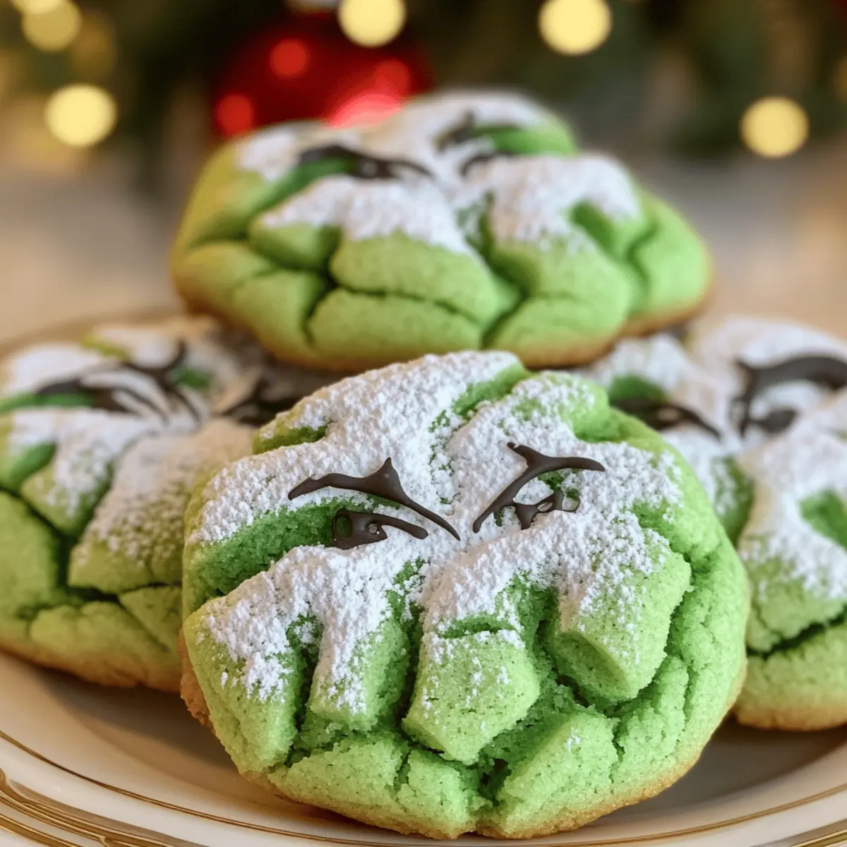 These Grinch Crinkle Cookies are perfect for busy holiday schedules! You can prepare the cookie dough up to 24 hours in advance by following the first six steps and then refrigerating the covered dough. This chilling allows the flavors to meld and enhances the cookie texture, ensuring they maintain their delightful chewiness. If you want to go even further, you can form the cookie balls and roll them in powdered sugar, then refrigerate them for up to 3 days. Just bake them straight from the fridge when you’re ready to enjoy, following the baking instructions as usual. With these make ahead tips, you’ll have lovely cookies ready to impress with minimal last-minute effort!