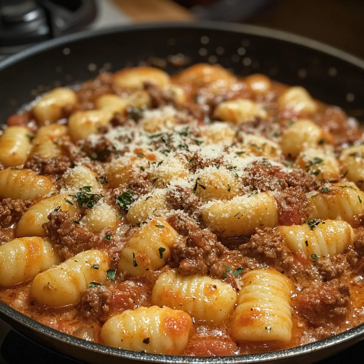 Mix in the freshly grated Parmesan cheese and season with salt and pepper to taste, stirring until the cheese melts and integrates into the sauce. Serve your delicious Ground Beef Gnocchi warm, garnished with additional cheese or fresh herbs if desired, for a comforting meal that satisfies.