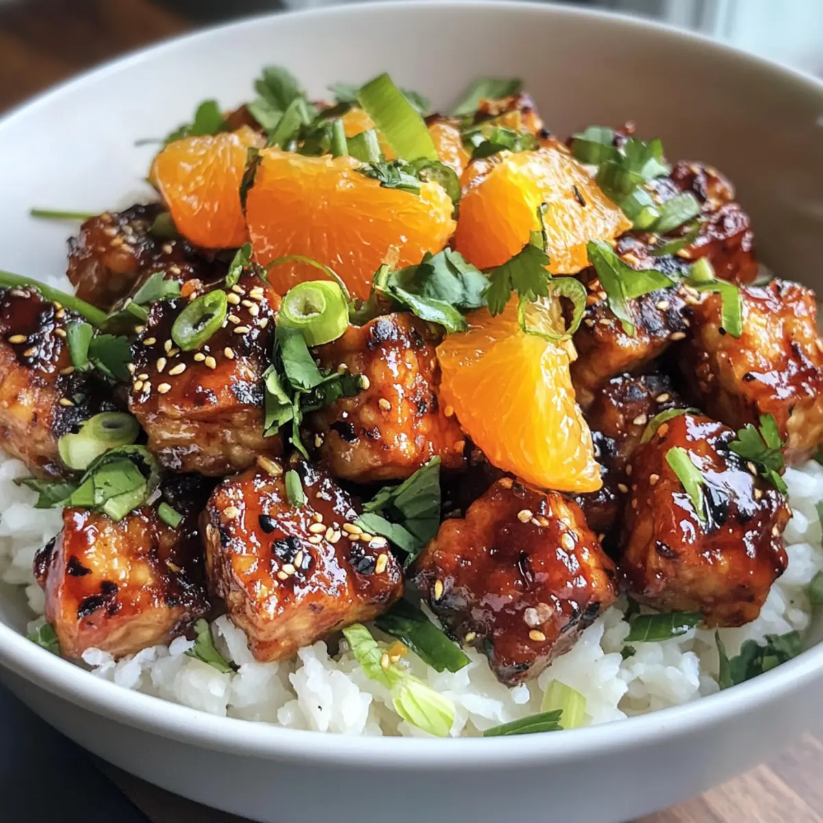 To serve your Korean BBQ Tempeh, plate warm short-grain rice as the base. Generously top the rice with the sticky BBQ tempeh crumbles, ensuring some of that rich sauce drizzles down. Finally, add a refreshing scoop of the citrus salad on top, letting its vibrant flavors balance the savory tempeh for a delightful meal experience.
