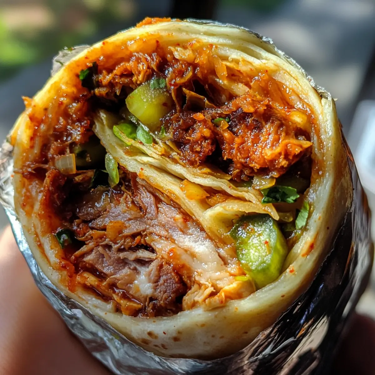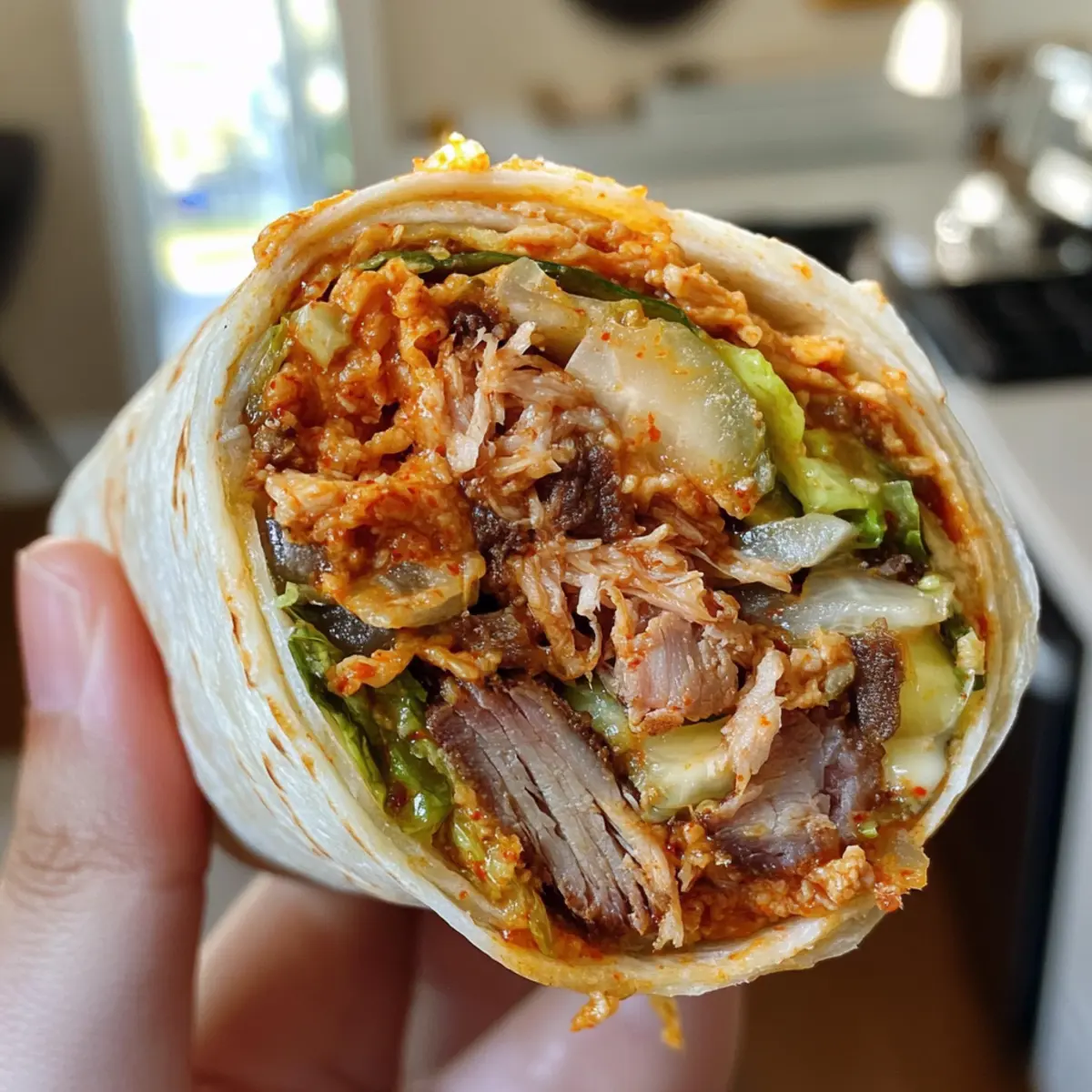 - Assemble the Burritos: Shred the pork. Warm tortillas in skillet for 30 seconds per side. Layer cooked rice, shredded pork, pickled veggies, fresh herbs, and kimchi mayo in the center of each tortilla.