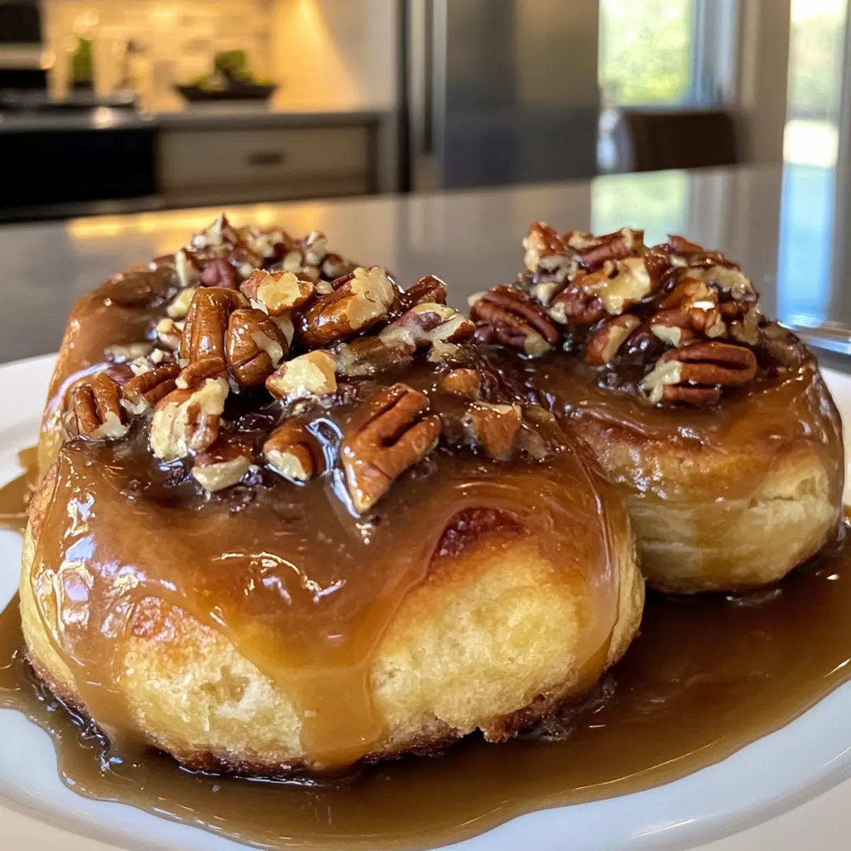 - Allow the buns to cool in the dish for 5 minutes. Carefully flip the dish onto a serving tray, letting the sticky topping cascade over the buns. Serve warm and enjoy.