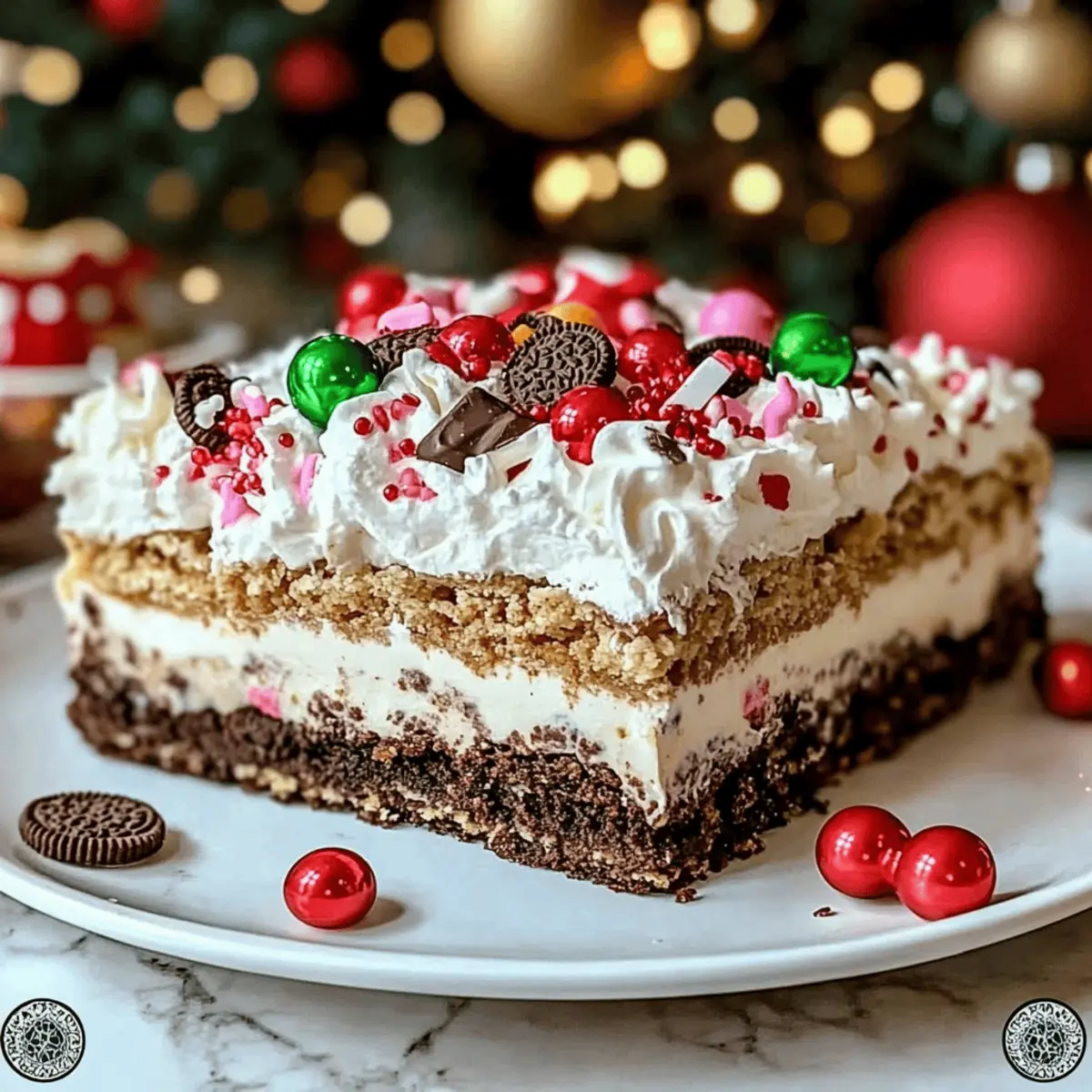 - Spread the remaining 1 1/2 cups of whipped topping over the dessert to create a light, fluffy finish. For a festive touch, sprinkle with colorful Christmas sprinkles and add mini M&Ms or holiday candies if desired. Cover the pan with plastic wrap and chill the no-bake cookie lasagna in the refrigerator for at least 4 hours or overnight.