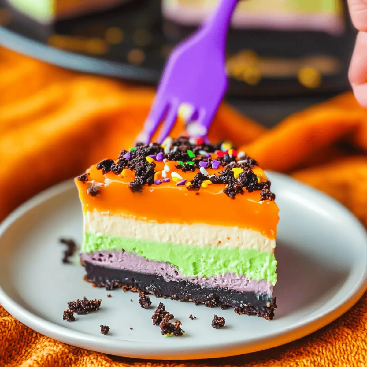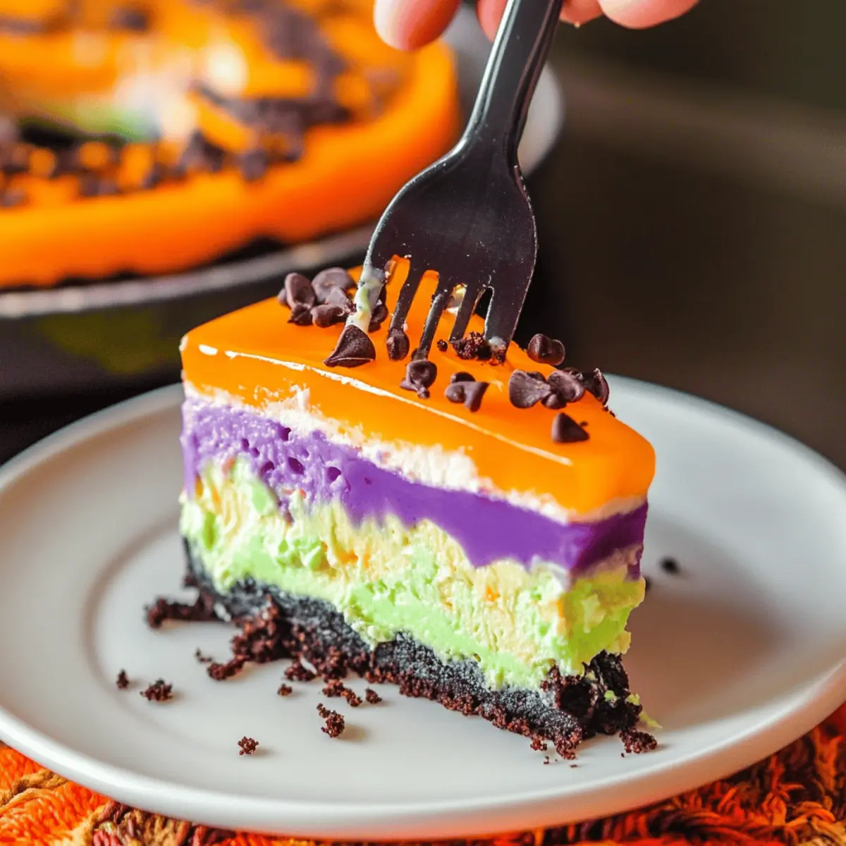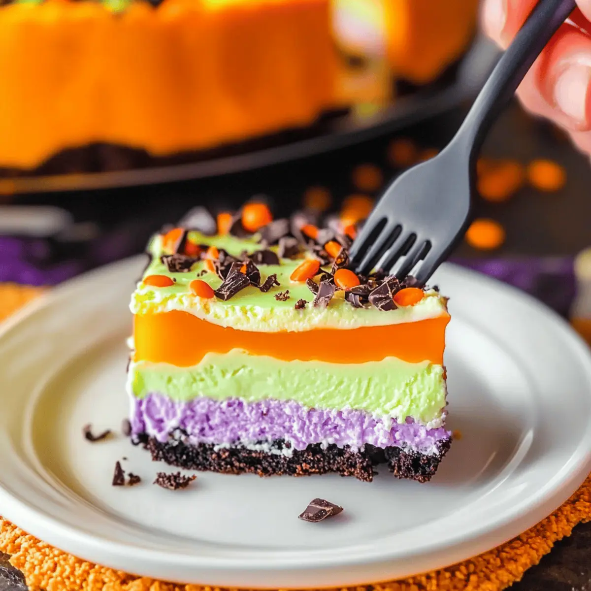 After chilling, remove the dessert from the refrigerator and use a sharp knife to slice it into squares for serving. For a fun touch, garnish each piece with Halloween-themed sprinkles. Present your colorful layered masterpiece and get ready to delight family and friends with this festive treat!