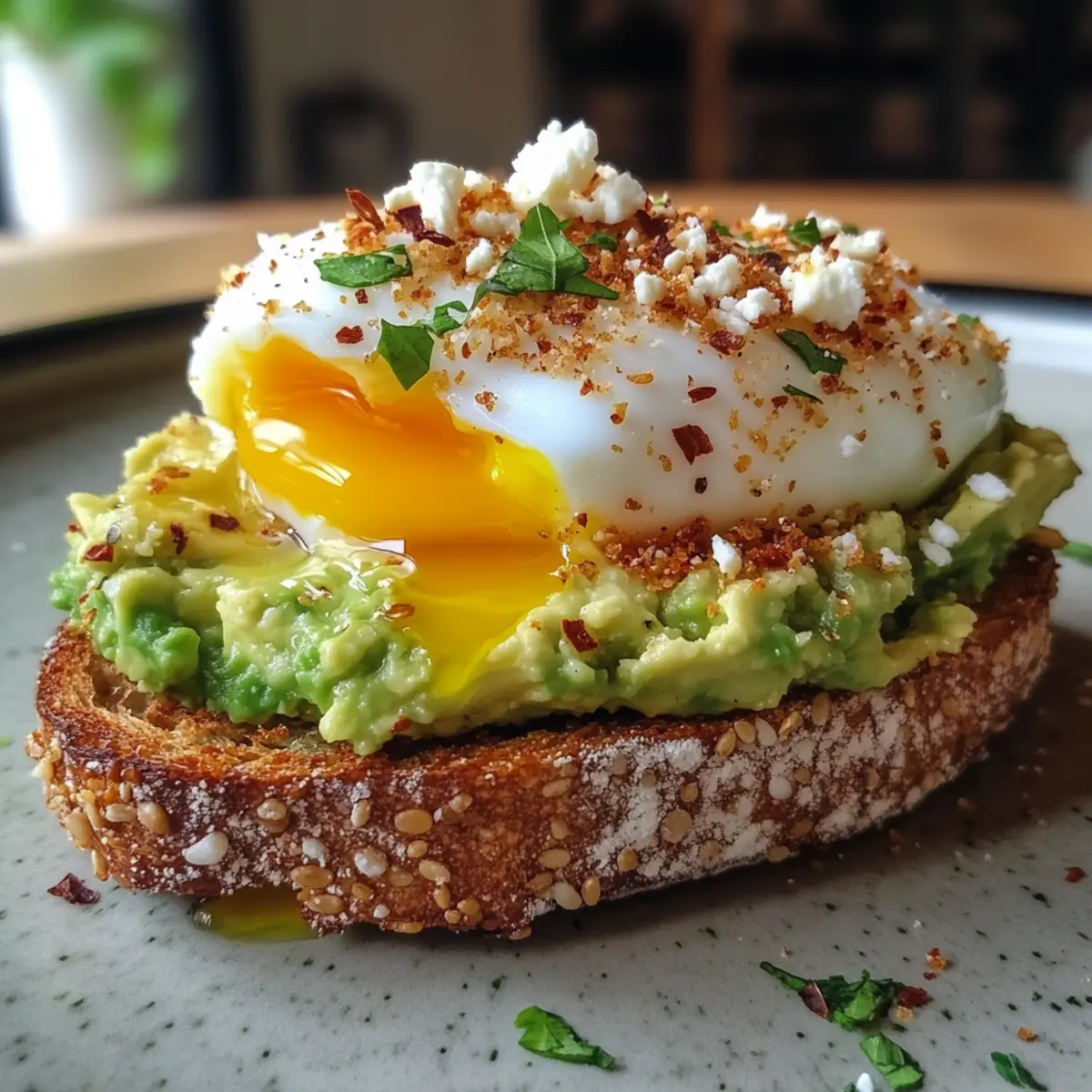 - Serve the Panko Poached Eggs over toast, topped with avocado, feta, chili flakes, and sea salt.