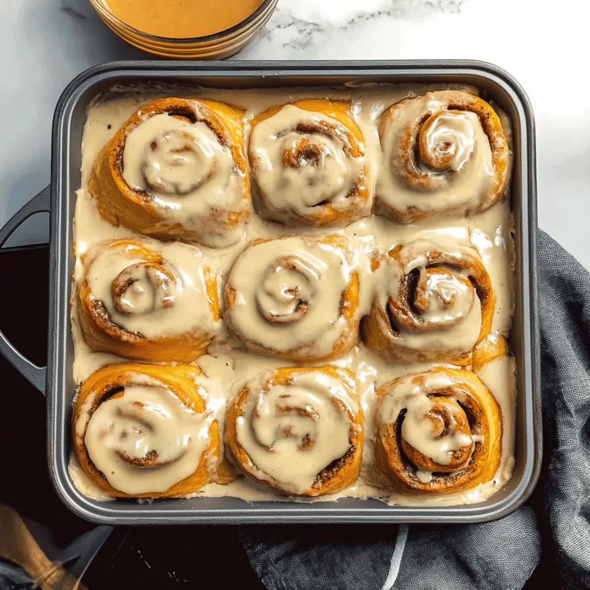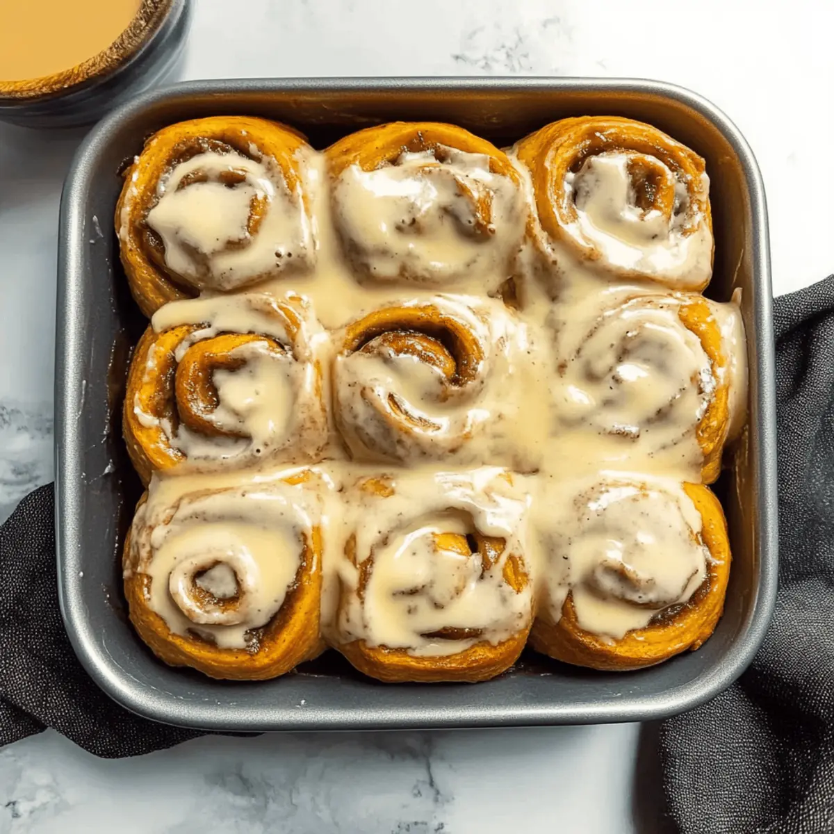 Place the sliced rolls in a greased 9″x13″ baking dish, ensuring they are close but not touching. Cover them with a kitchen towel and let them rise again for about 30 minutes while preheating your oven to 350°F. This second rise will ensure the rolls are light and fluffy, ready to bake into delightful Pumpkin Cream Cheese Cinnamon Rolls.