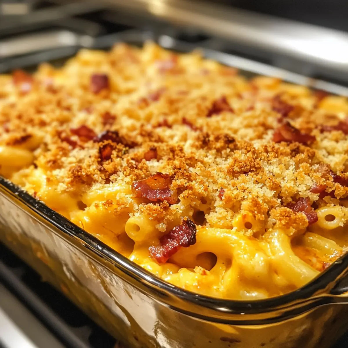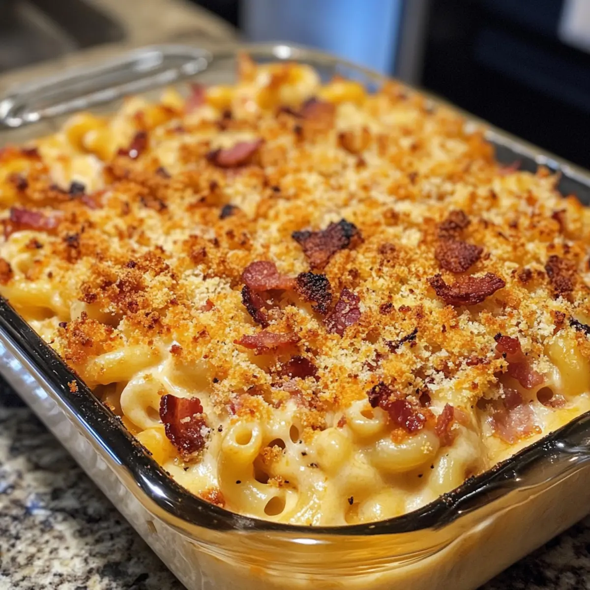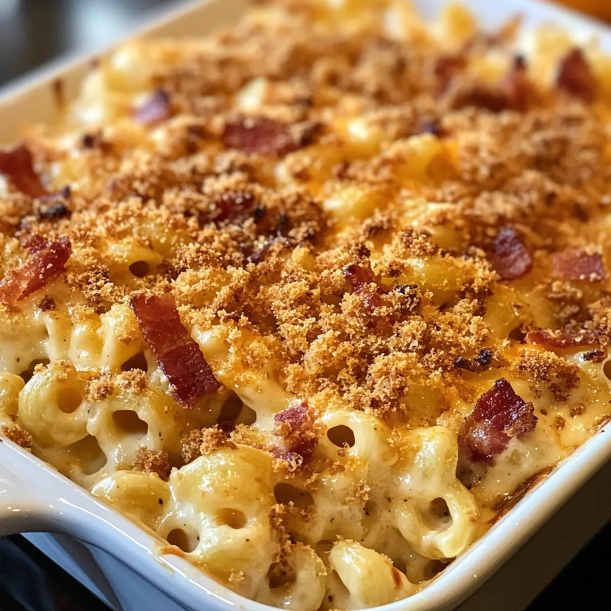 - Pour into the baking dish, top with toasted breadcrumbs and remaining bacon.