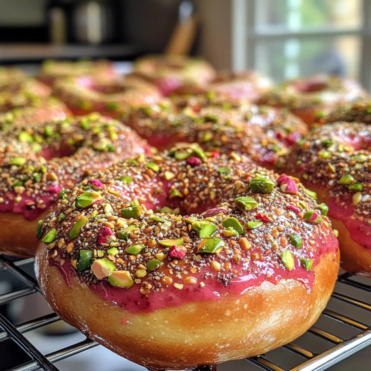 - Preheat the oven to 425°F (220°C), transfer boiled bagels to the tray, sprinkle with chopped pistachios, and bake for 20-25 minutes until golden brown.