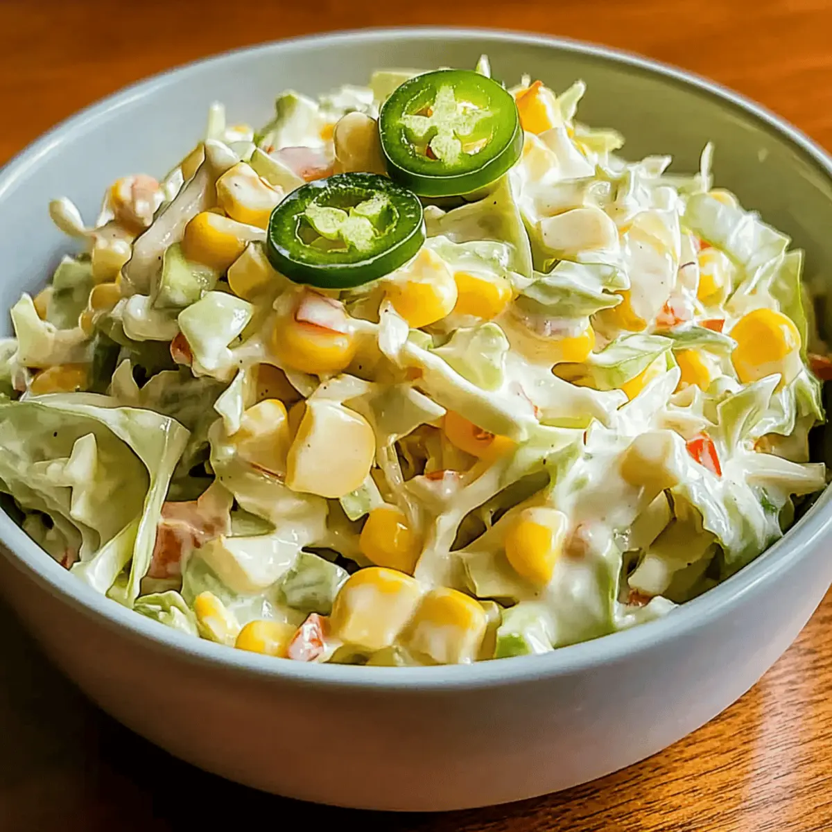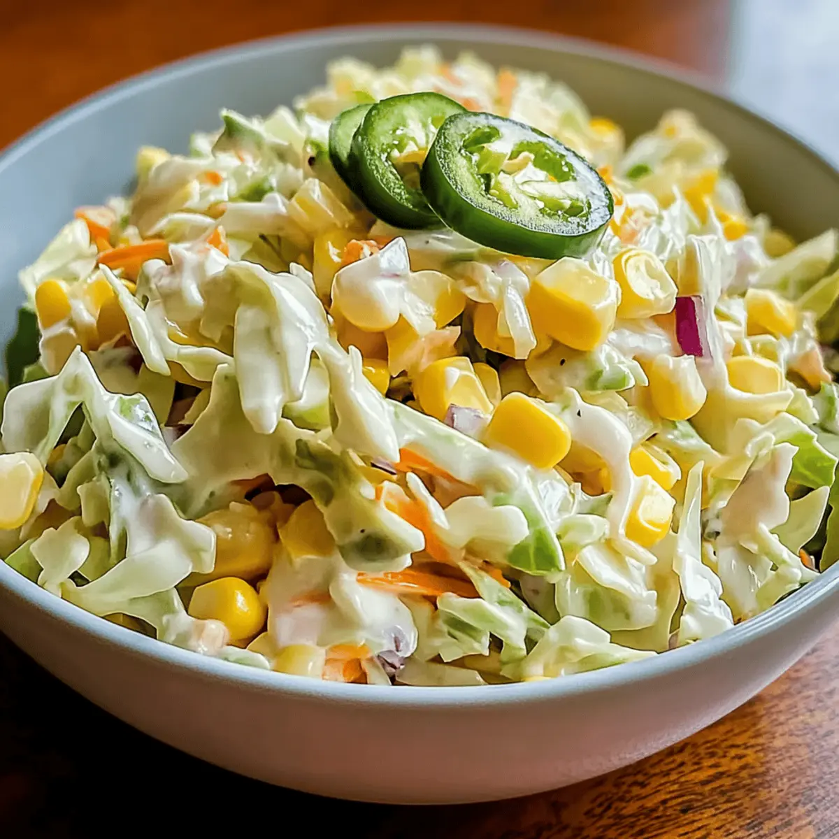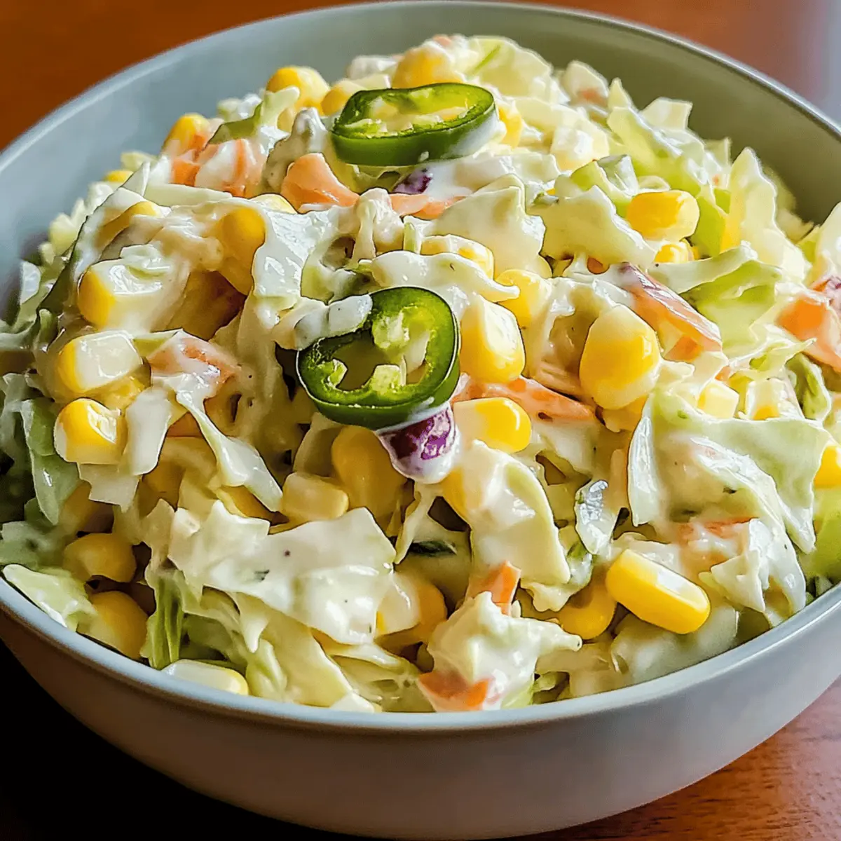 Vibrant Colors: The Spicy Jalapeno Corn Coleslaw is a feast for the eyes, featuring a colorful mix of fresh vegetables that brighten up any plate.