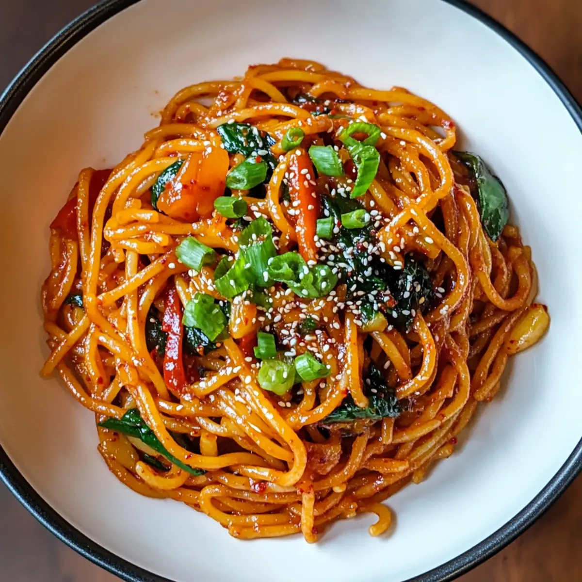 Stir in 1/4 cup of sliced green onions and 1 tablespoon of sesame seeds, cooking for an additional minute to warm through. Taste and adjust seasoning with salt and pepper as needed. The combination of fresh green onions and the crunchy sesame seeds enhances the overall flavor of your spicy Korean gochujang pasta.