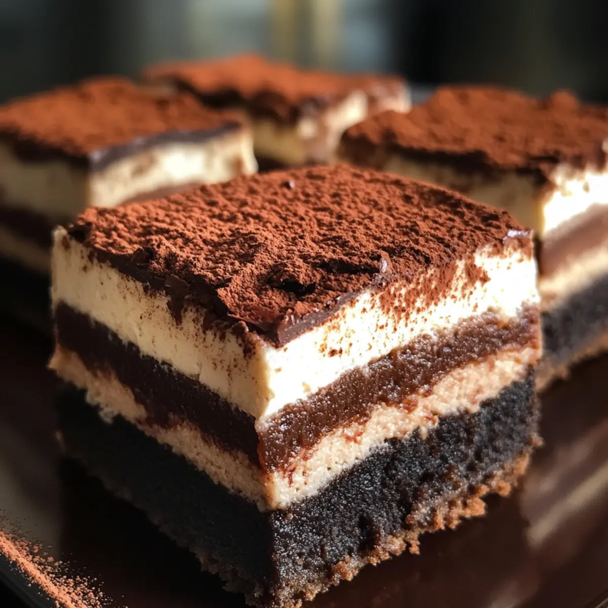 Now that everything is cool, cut the brownie layer into squares. Prepare a shallow dish with espresso or strong brewed coffee for soaking the ladyfingers. Dip each ladyfinger in the coffee quickly, ensuring they don’t get too soggy. Layer the brownie squares with soaked ladyfingers and spread a generous layer of the mascarpone cream on top. Repeat layers, finishing with a layer of cream on top.